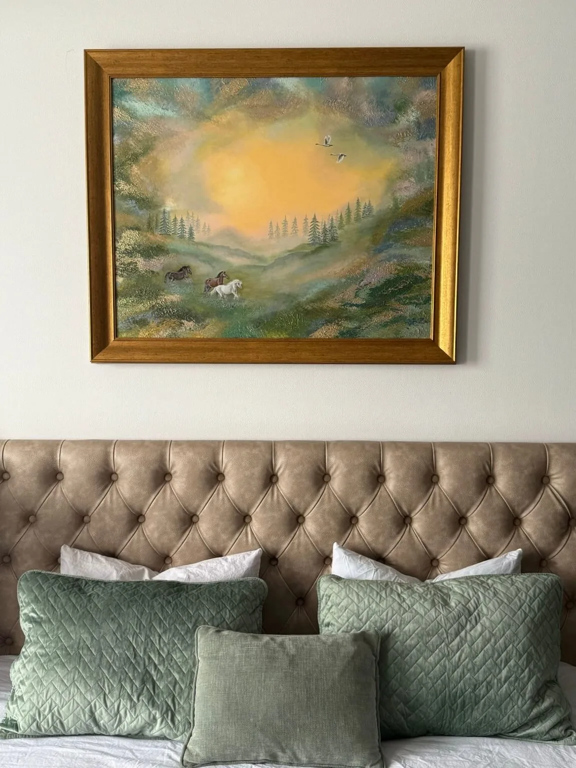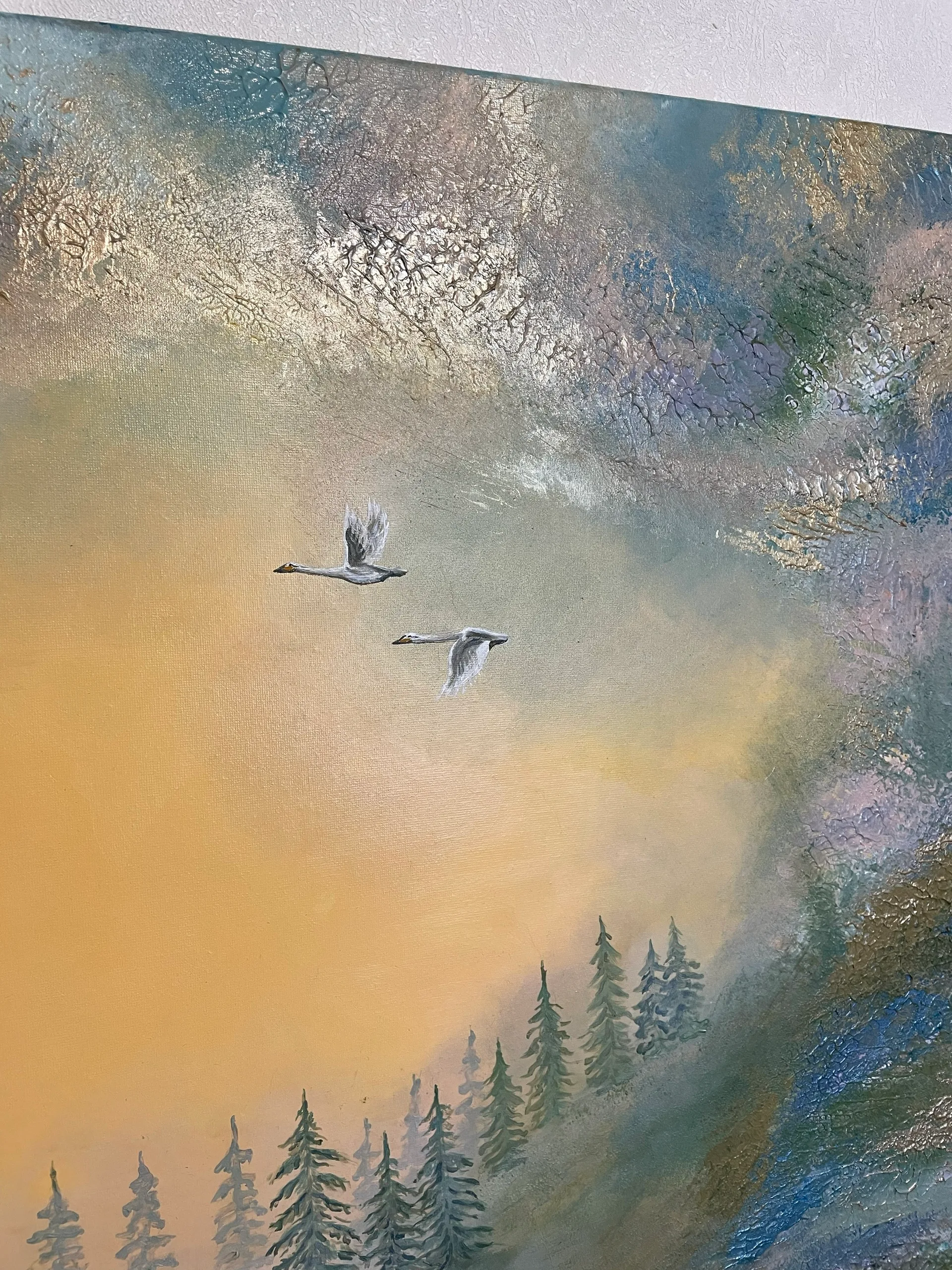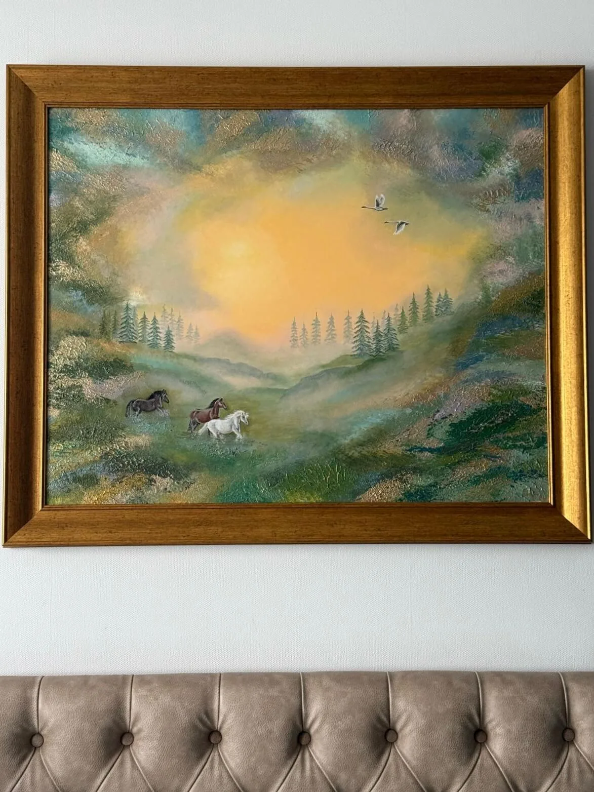 This artwork presents a world where space and light create a calm, meditative atmosphere. A textured gel technique is used to add relief and visual dimension to the surface. Warm golden light and pastel tones dominate the painting, creating a sense of tenderness, harmony, and unity with nature. “Dream World” conveys an emotion of freedom and tranquility — a world where nature, movement, and light become one complete story.