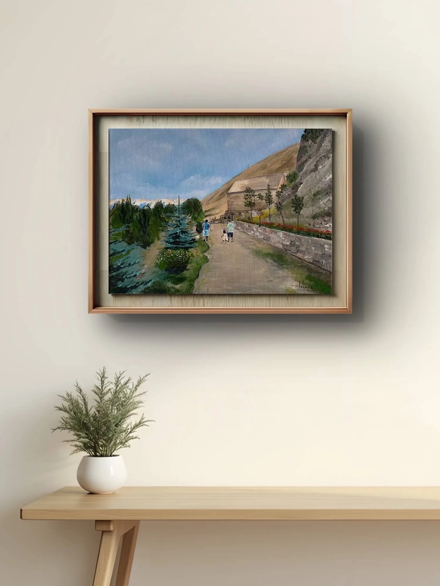 This artwork is painted in acrylic on canvas using layered applications and smooth tonal gradients. Free brushwork and detailed strokes create perspective, volume, and an airy sense of depth within the landscape.