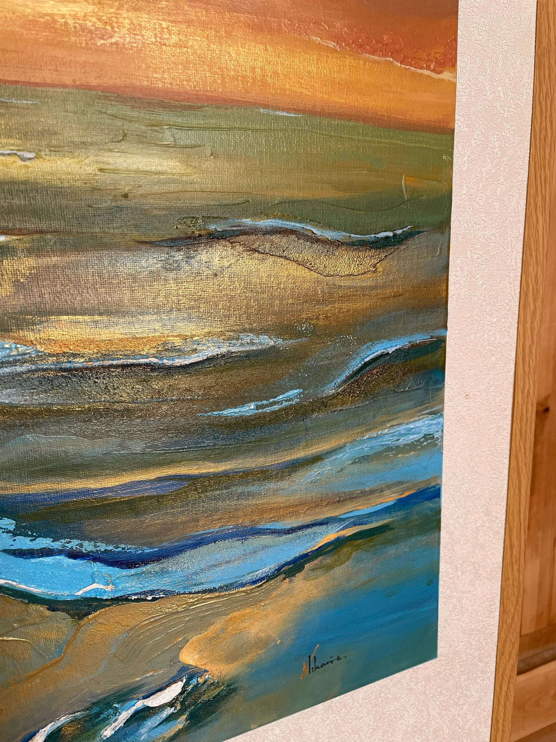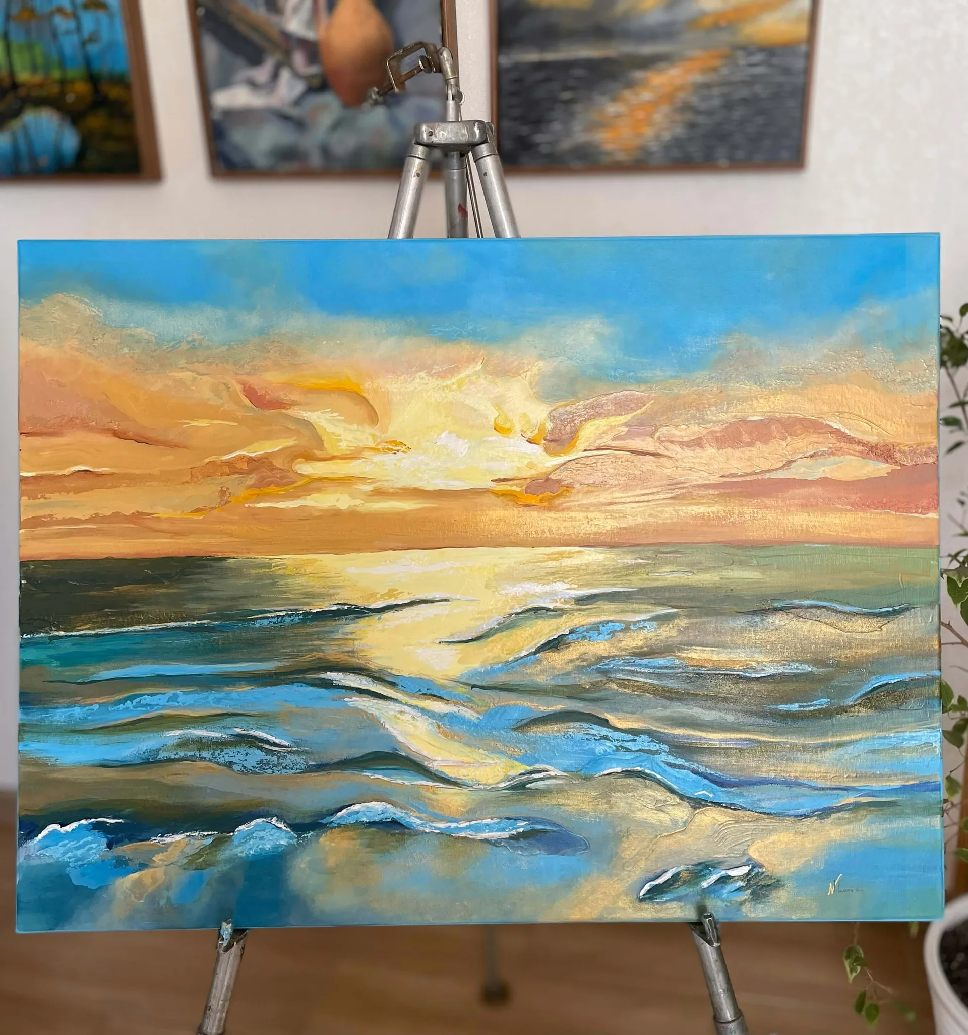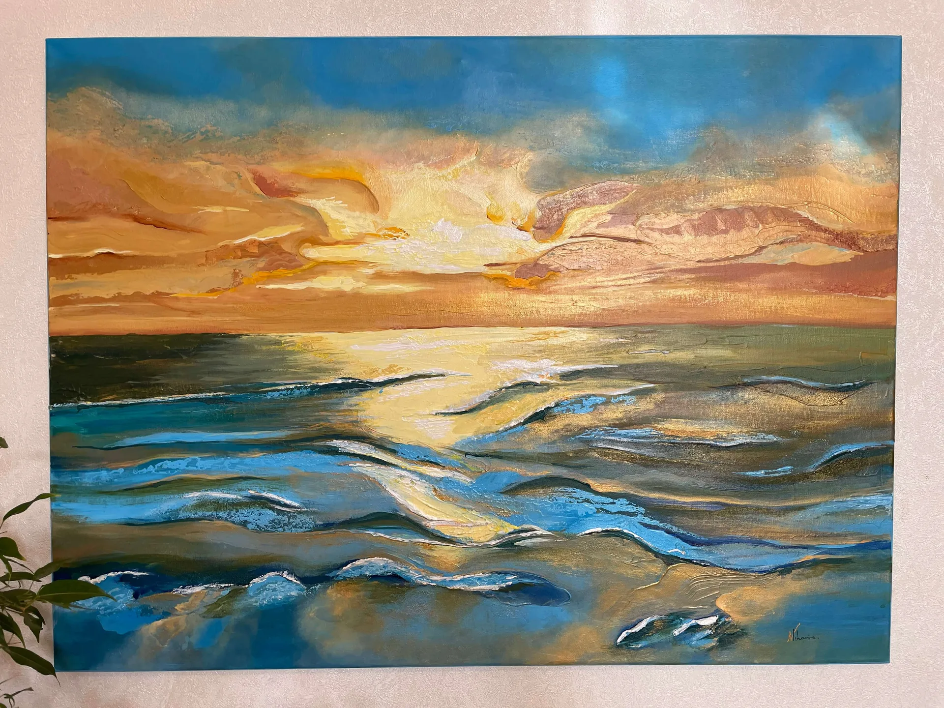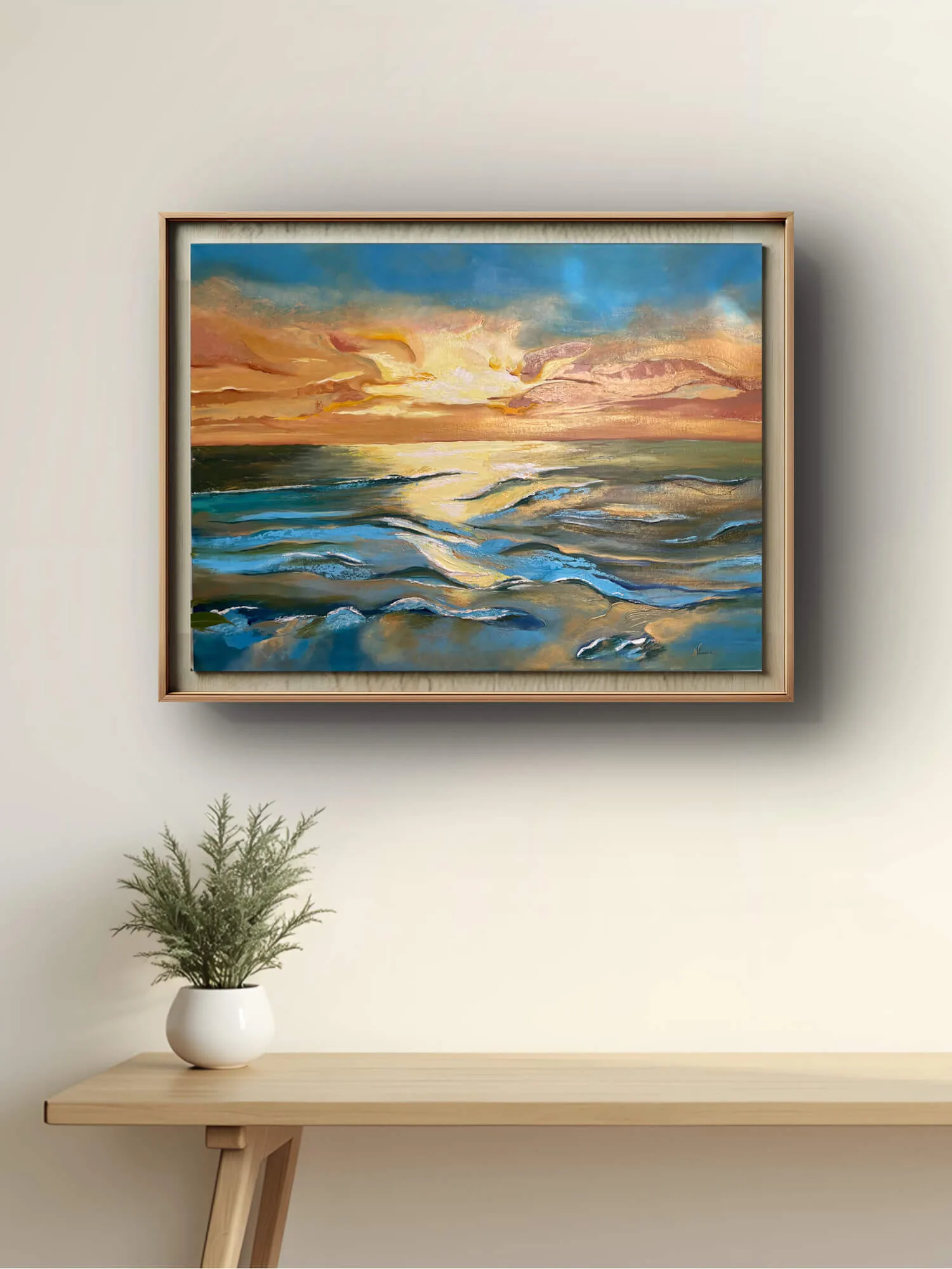 This artwork captures the sea horizon at sunset, where warm golden light reflects across the water and fills the space with a luminous glow. The composition is built through energetic brushstrokes, giving the waves movement and a vivid rhythm. Cool blue and turquoise tones blend harmoniously with warm orange and rosy shades in the sky, creating an emotional contrast and a strong sense of depth. The painting conveys a feeling of freedom and serenity.